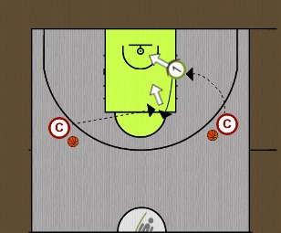 24.Vaja: Žogo iščemo na nizkem postu nato pa postavljamo blokado in se odvajamo na mesto visokega posta. Po podaji mečemo na koš, zgrešen met pa popravimo.