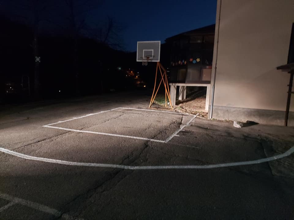 Zarisovanje črt okoli koša postavljenega pred mladinskim centrom Idrija.