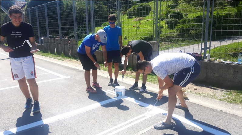 Zarisovanje črt in obnova športnega parka pred uradnim FIBA 3x3 dogodkom. V dveh dneh smo popravili tri koše in zarisali črte na petih košarkarskih igriščih.